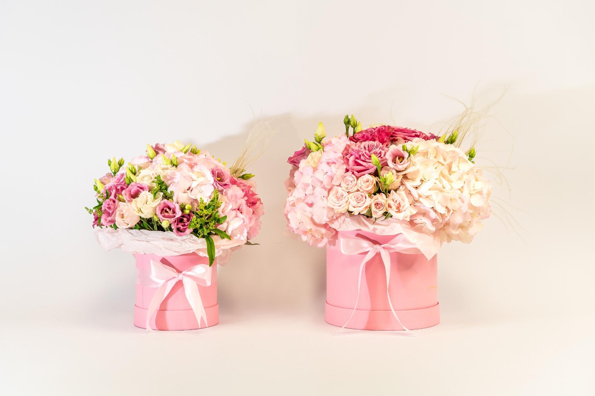 Изпълнена с хортензии, божурести рози, розова еустома и ефирно коило.