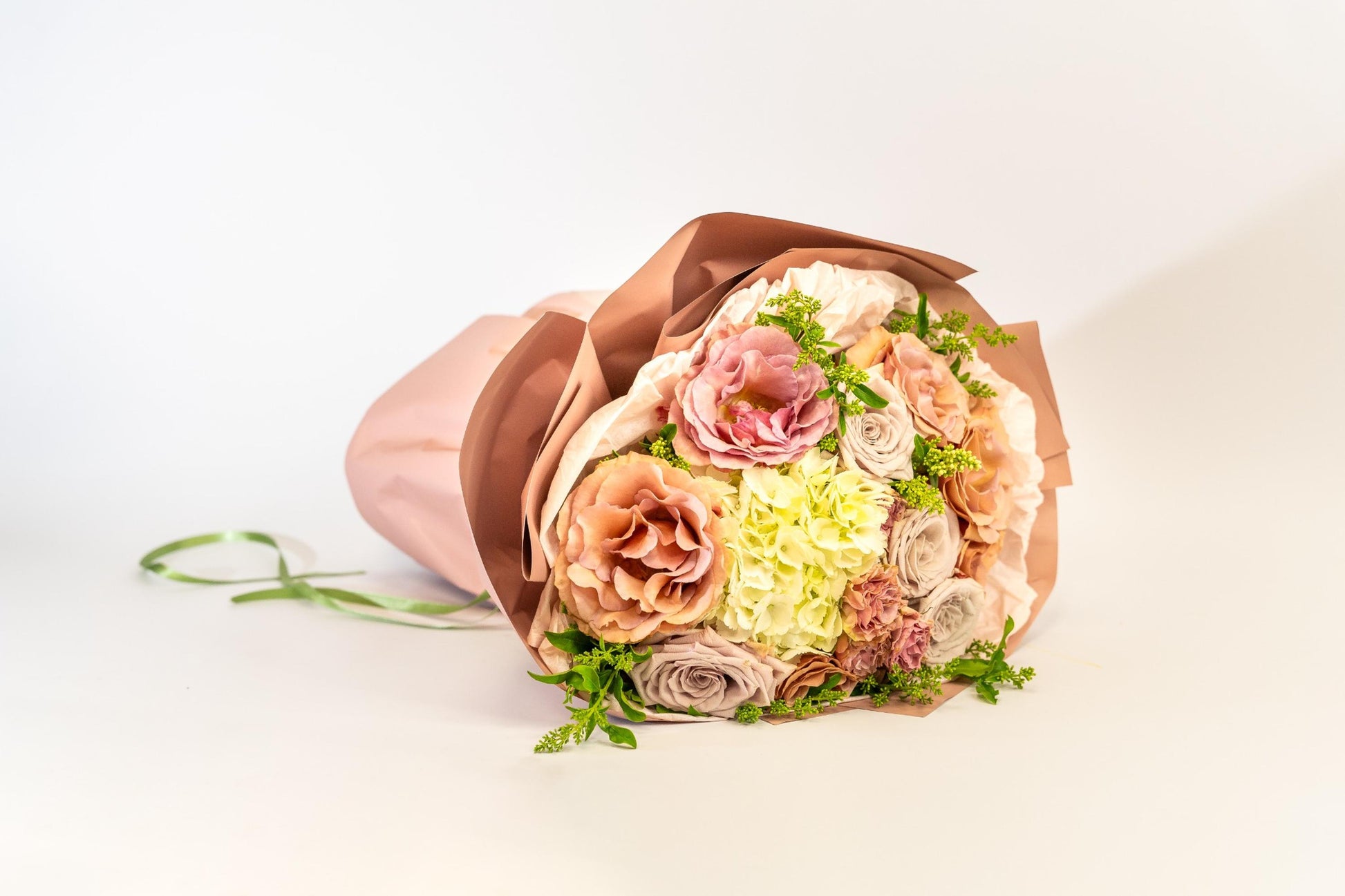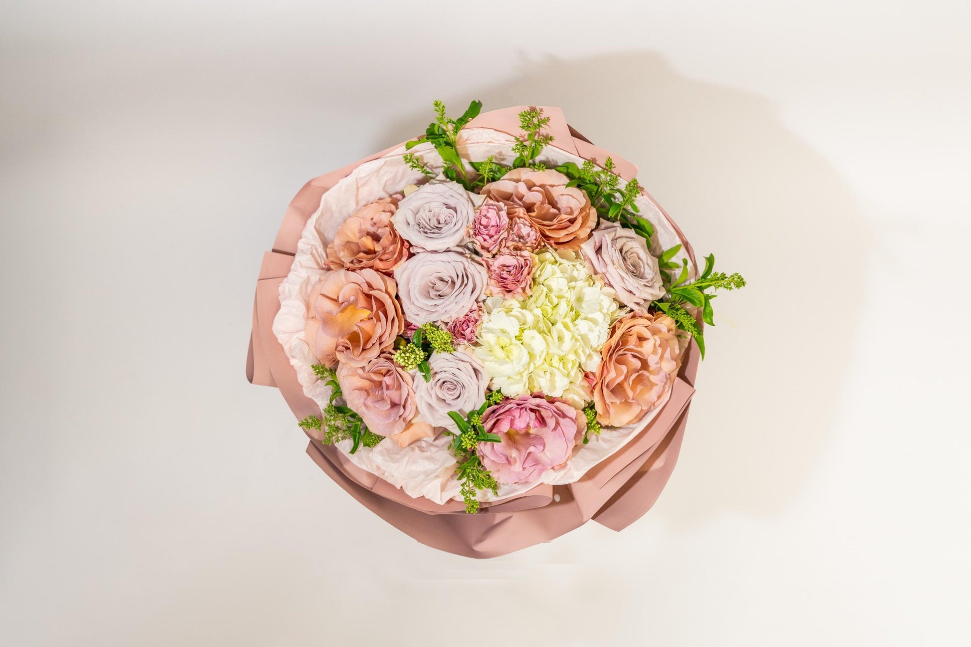 Комбиниран букет от три сорта рози и хортензия. Вдъхновен от любимите ни рози RP Moab – копринено меки на допир. Стилът им е без усилие елегантен, добавяйки нотка на сдържан лукс към всяка композиция.