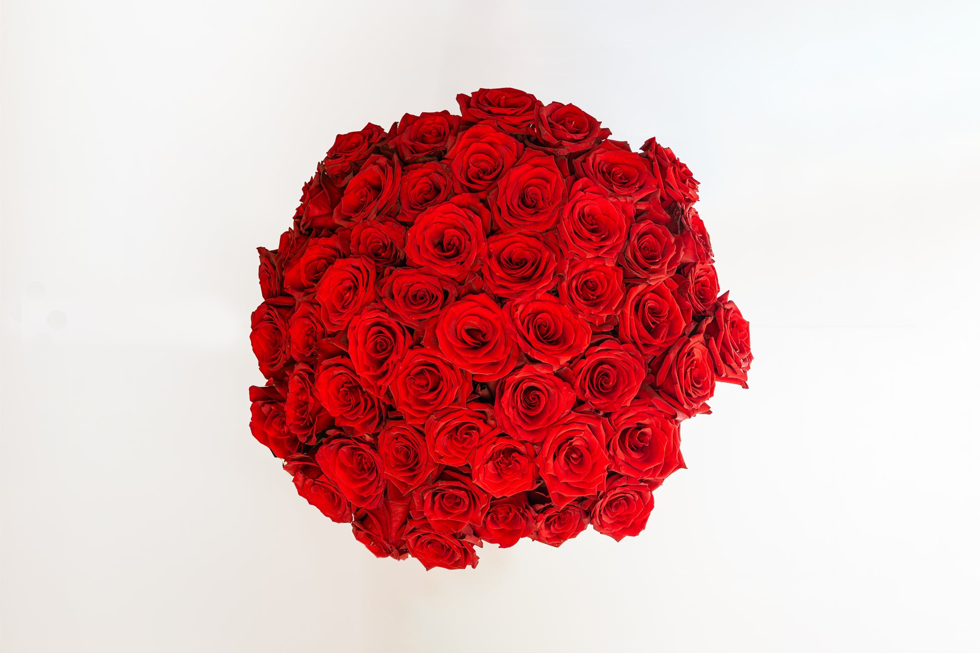 Ръчно и прецизно подредени на спирала, за да имат перфектна овална форма. Завършени с елегантна червена панделка от сатен, тя не само допълва излъчването на розите, но и придава на букета допълнителна доза изтънченост и изисканост.